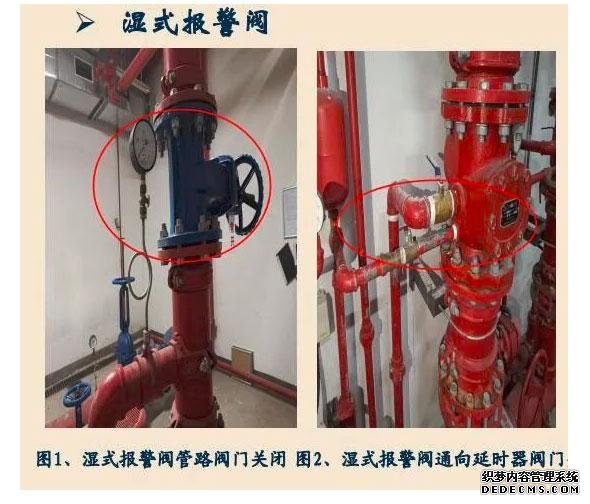 10、常见问题 湿式报警阀报警管路阀门关闭,通向延时器的阀门关闭,导致火灾时水力警铃、压力开关等均无法正常动作,影响报警及喷淋泵的启动。
