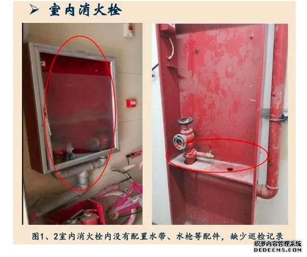 18、常见问题 消火栓箱内水带、水枪等配件不齐全,未放置灭火器。人员密集的公共建筑内未设置软管卷盘。